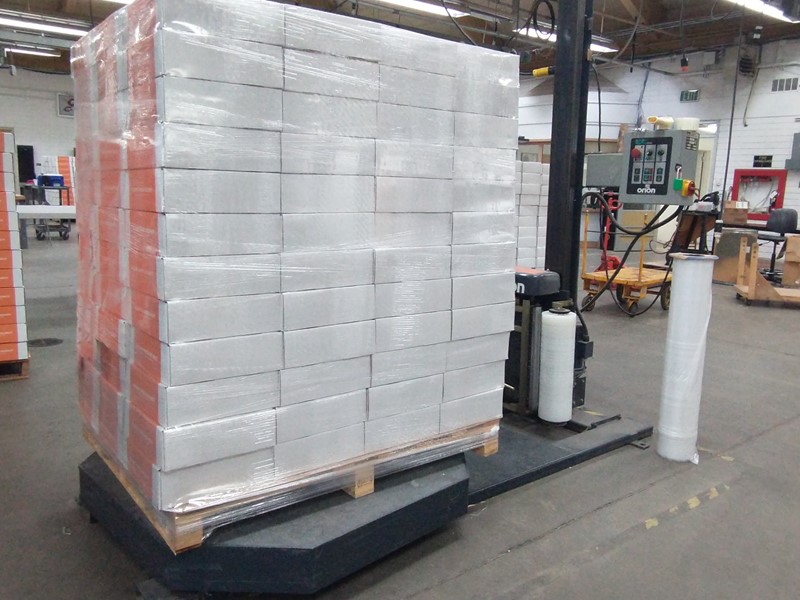 Once items are boxed up, can be palletized and stretched wrapped to hold the load in place for safer travel on the pallet via truck.