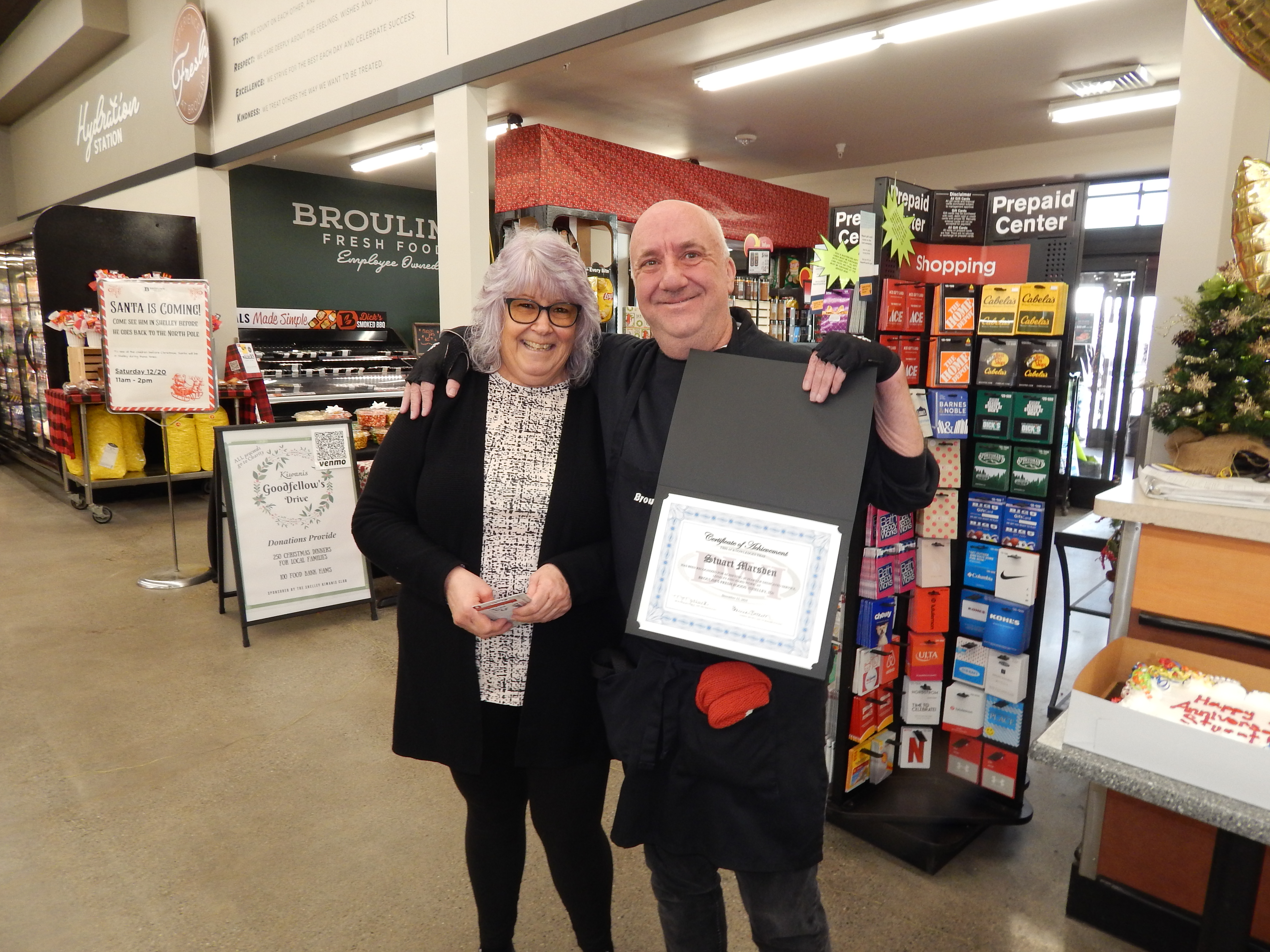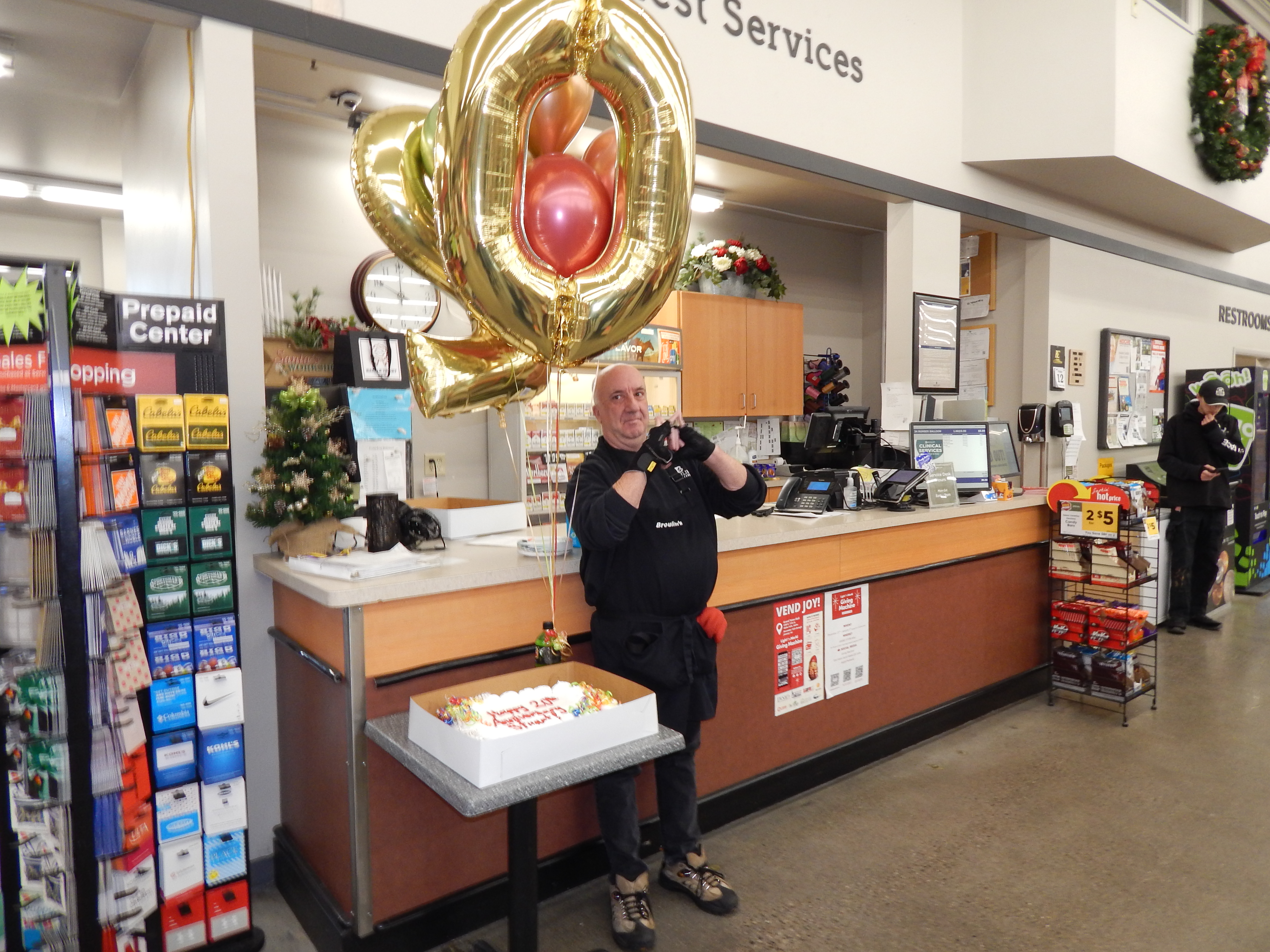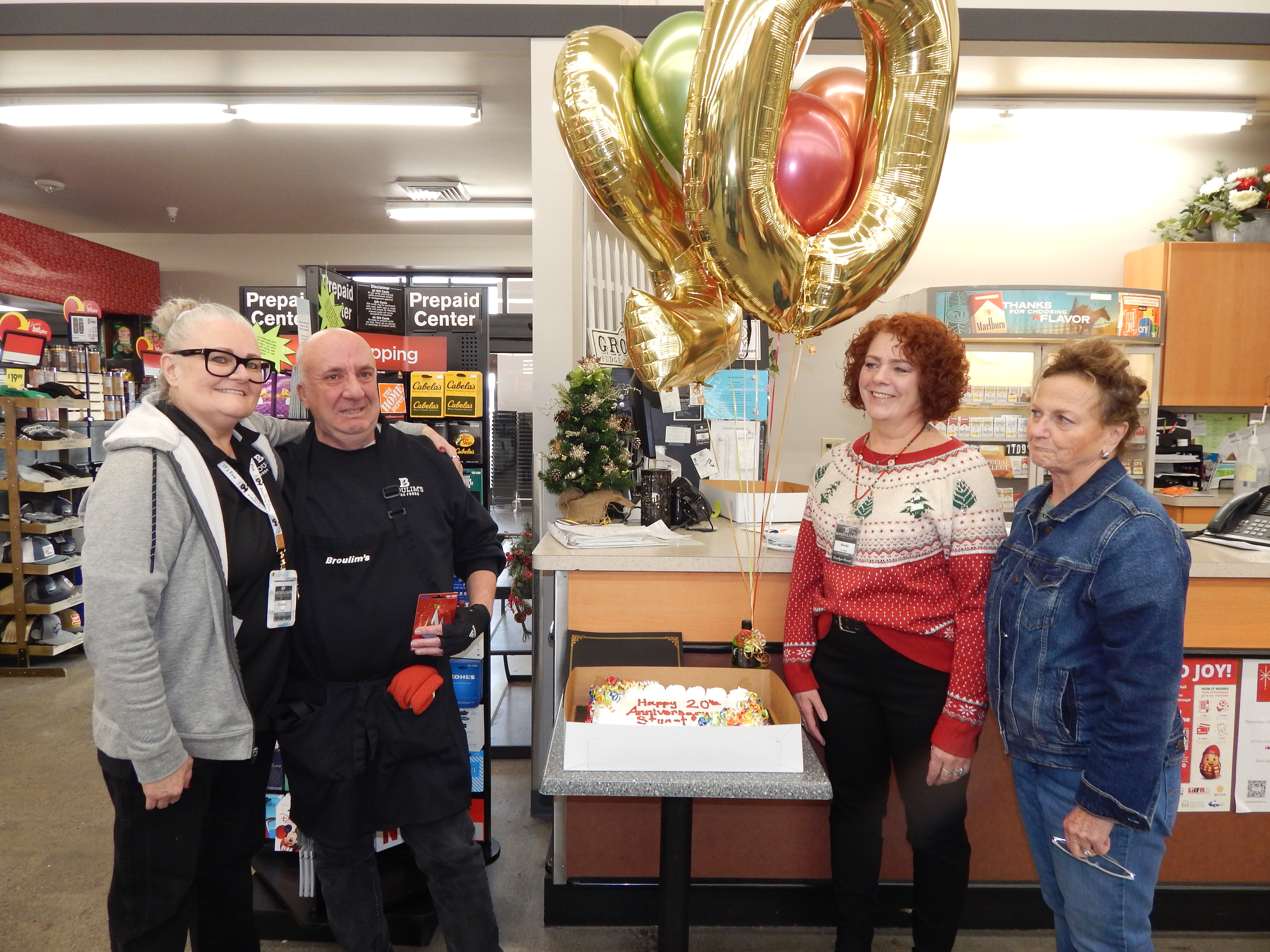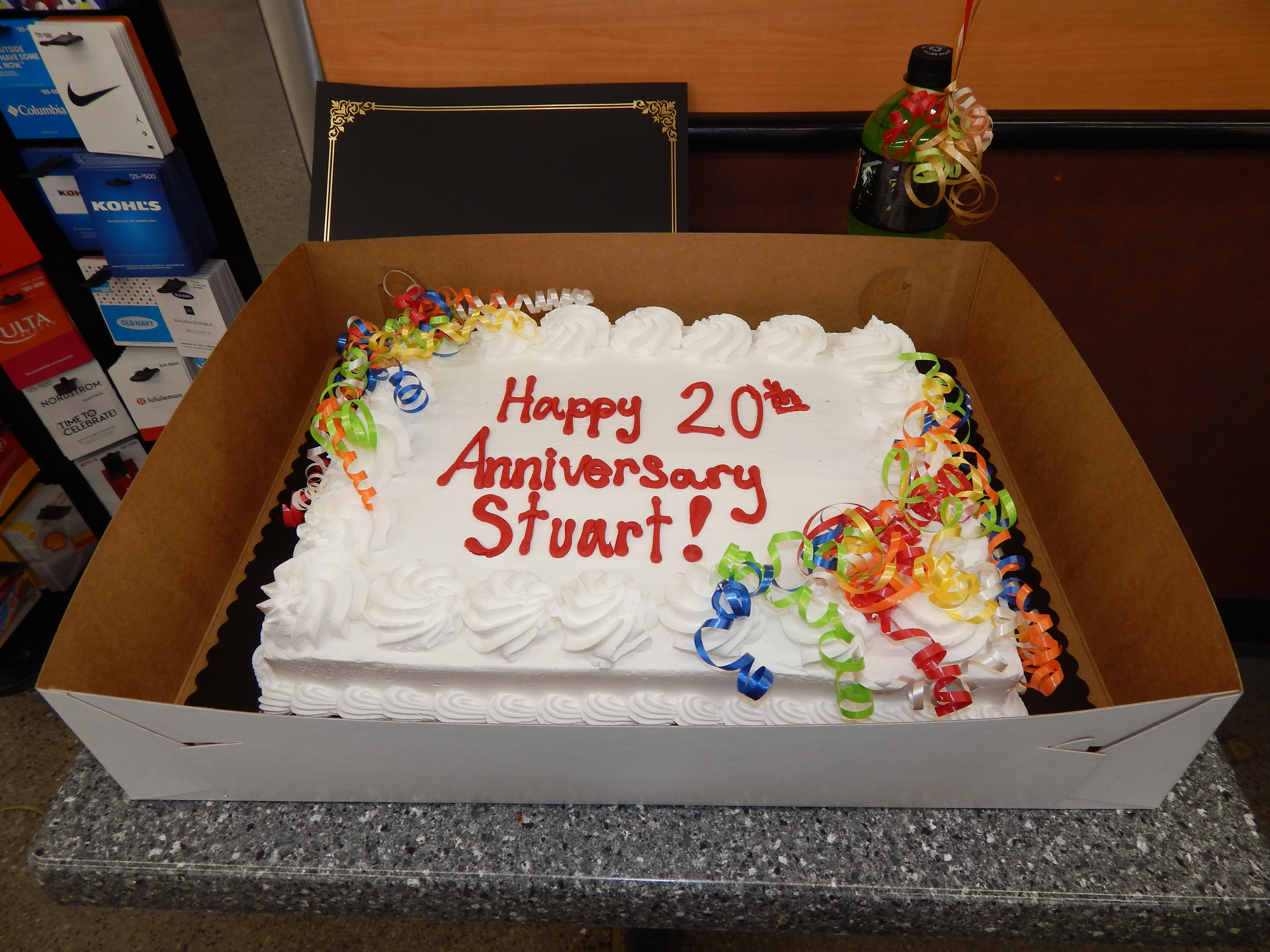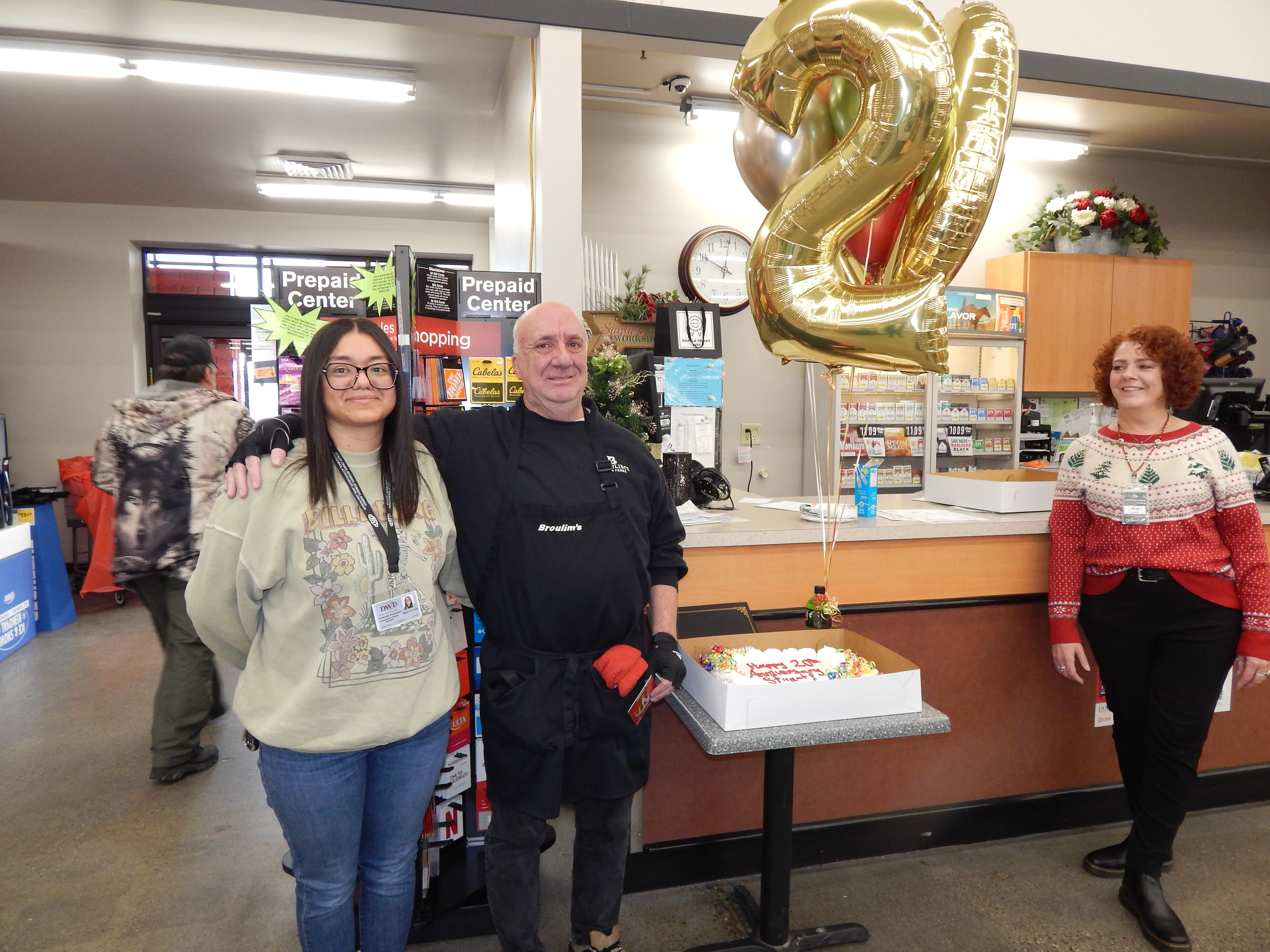 Last Friday, we had the honor of sharing in Stuart's 20th Anniversary working at Broulim's Fresh Foods in Shelley. DWI VP of Rehabilitation, Shirrie, presented Stuart with a certificate and a gift card. (and he knows exactly what to spend it on!) Broulims was decorated with balloons and everyone enjoyed a celebratory cake in his honor. Stuart truly loves working at Broulims and he said it's a good day when his coworkers and customers are happy. His Supervisor Rinda mentioned that he brings a ray of light when he comes into the store. Some customers from all over the area come shop the store just to see Stuart and say hello. Congratulations to Stuart on this incredible milestone. Thank you to Broulim's and to all of Stuart's job coaches for supporting Stuart on his journey. He said he would love to work until he is 80 or 90!